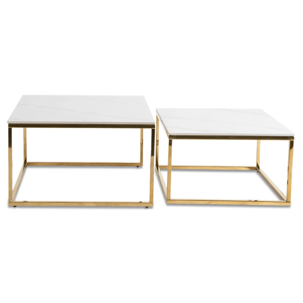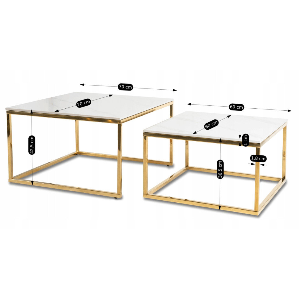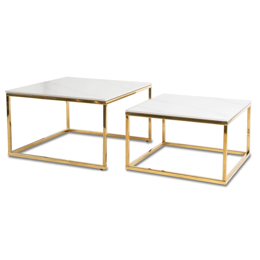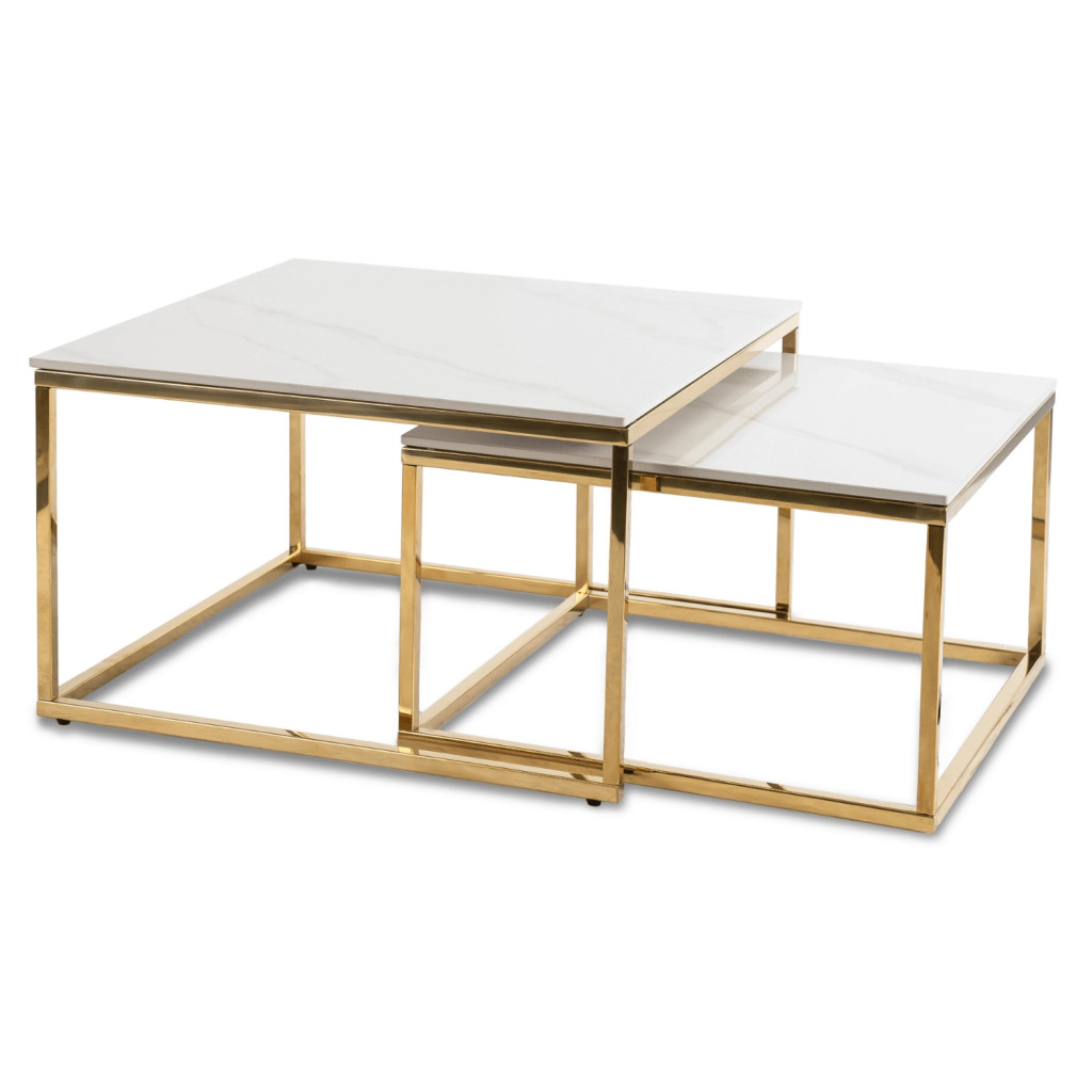 Set măsuțe de cafea ceramic, finisaj marmură albă, cadru auriu TENOR