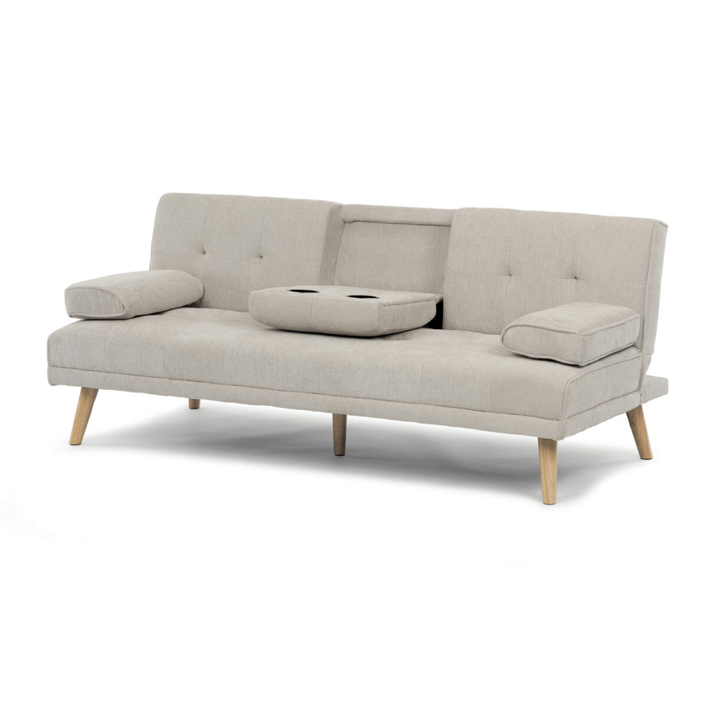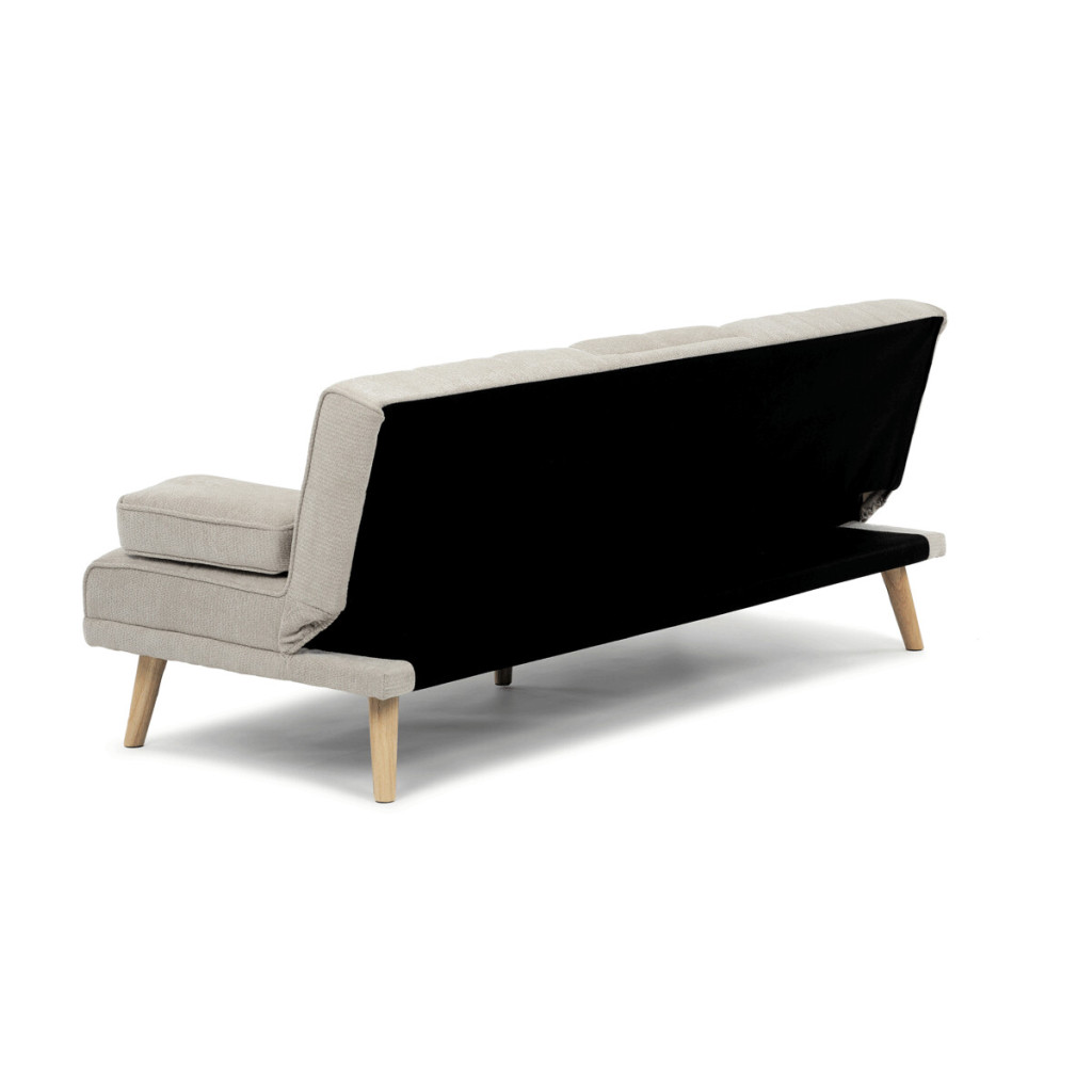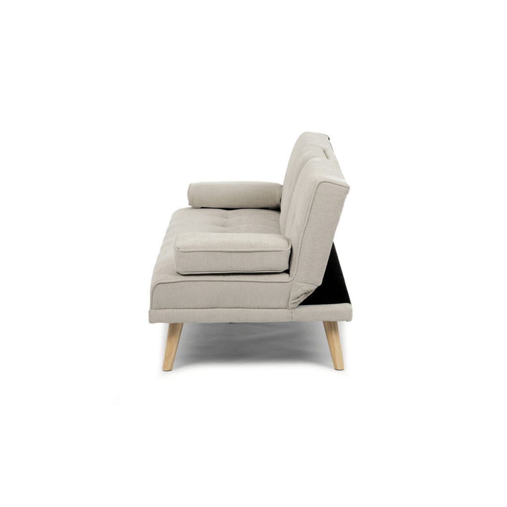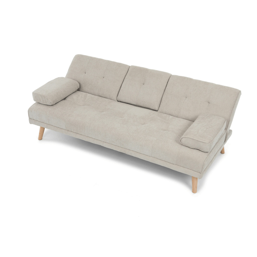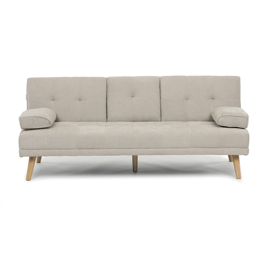 Canapea extensibilă confortabilă cu 3 locuri, tapițerie textilă bej și picioare din lemn natural – soluție elegantă pentru living. Modelul ASB-C3034, cu brațe laterale, oferă suport suplimentar și, extins, asigură o suprafață de dormit de 180x95 cm. Cadru solid din lemn masiv, capacitate de încărcare 300 kg. Livrare în 14 zile lucrătoare.