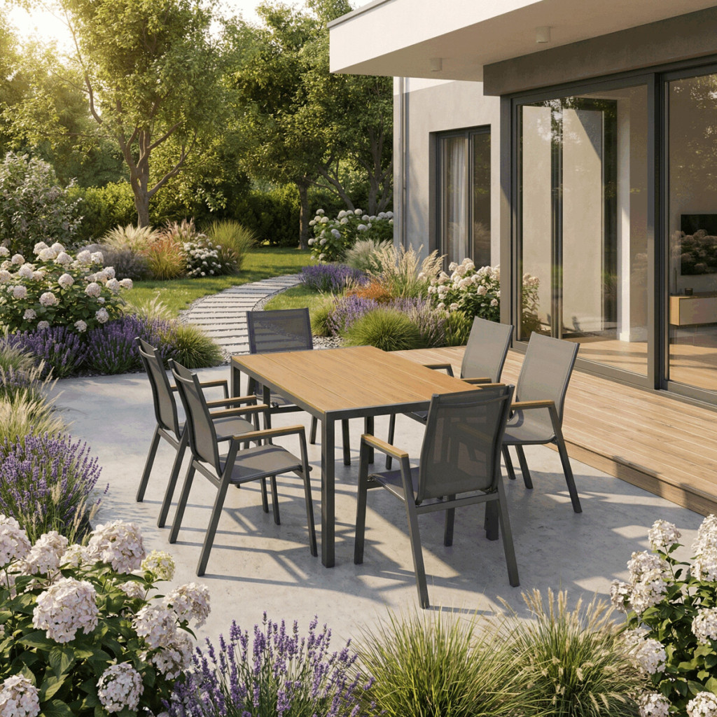 Masă grădină 150x89 cm, metal, polywood, maro (stejar), AZT-S1215 OAK