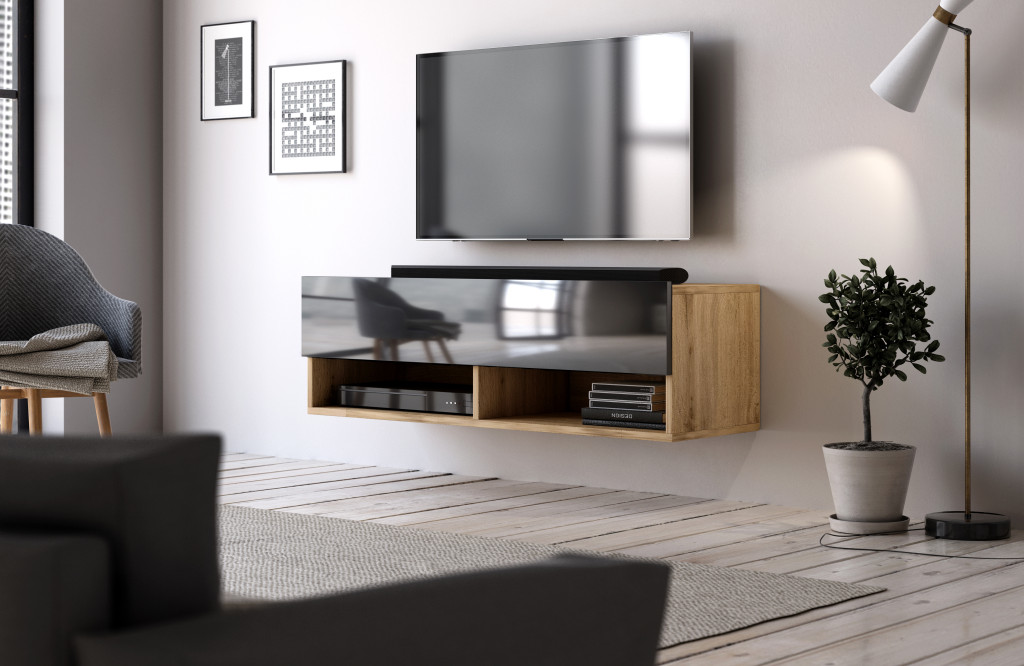 Comodă TV 100 cm, 1 ușă, culoare stejar wotan/negru lucios DERBY